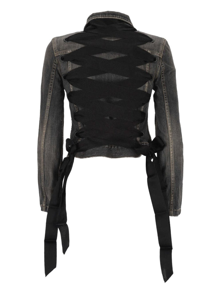 Cotton denim, fully laced up at the back, 5 buttons at the front, 2 buttoned pockets at the chest, 2 slash pockets and jeans buttons and jeans eyelets with Balenciaga engraving. lace up Lace-up denim jacket.
