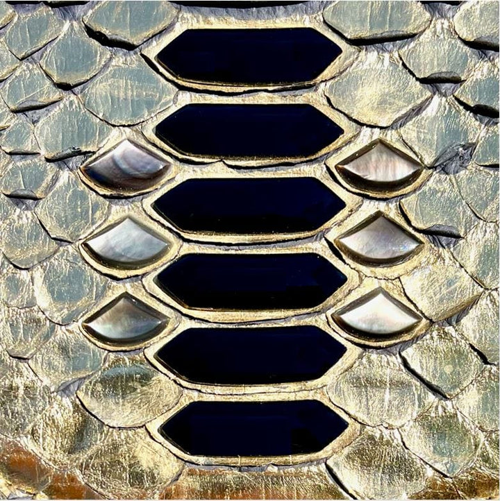 This glamorous Python Clutch is an ideal accessory to add a little glamour and sparkle to your ensemble. The stylish python leather is crafted in an eye-catching metallic gold and complemented by Onyx and Grey Mother Pearl Decoration.
