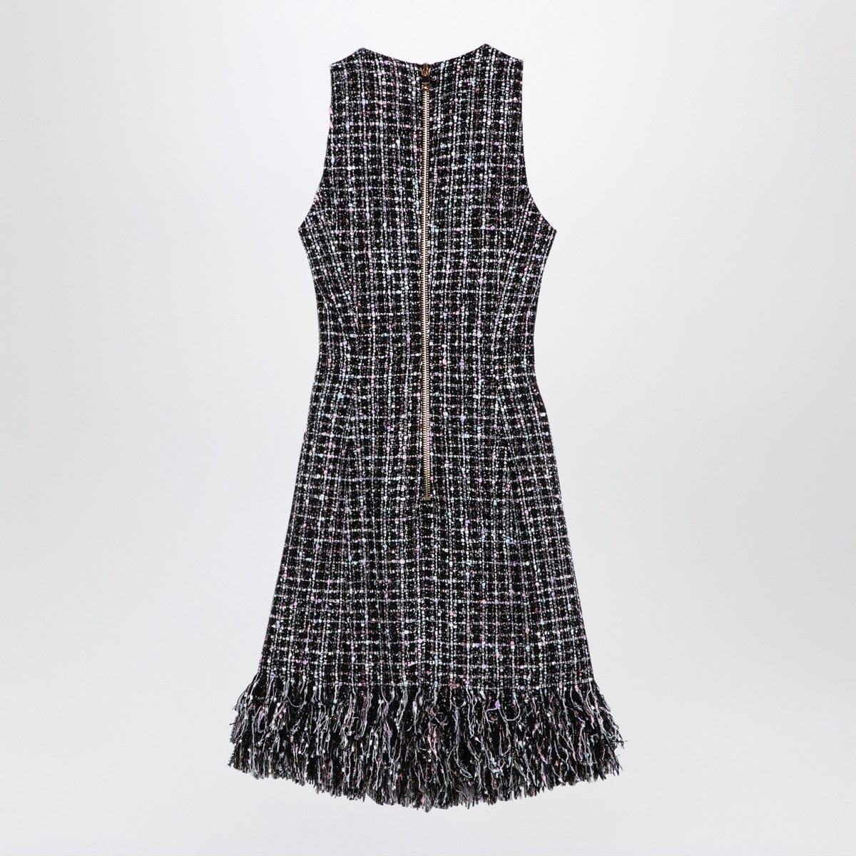 Sleeveless tweed mini dress with shiny threads by Balmain, features a sweetheart neckline, a fitted fit, decorative gold-tone metal logo buttons on the front, a back zip fastening and a fringed hem.