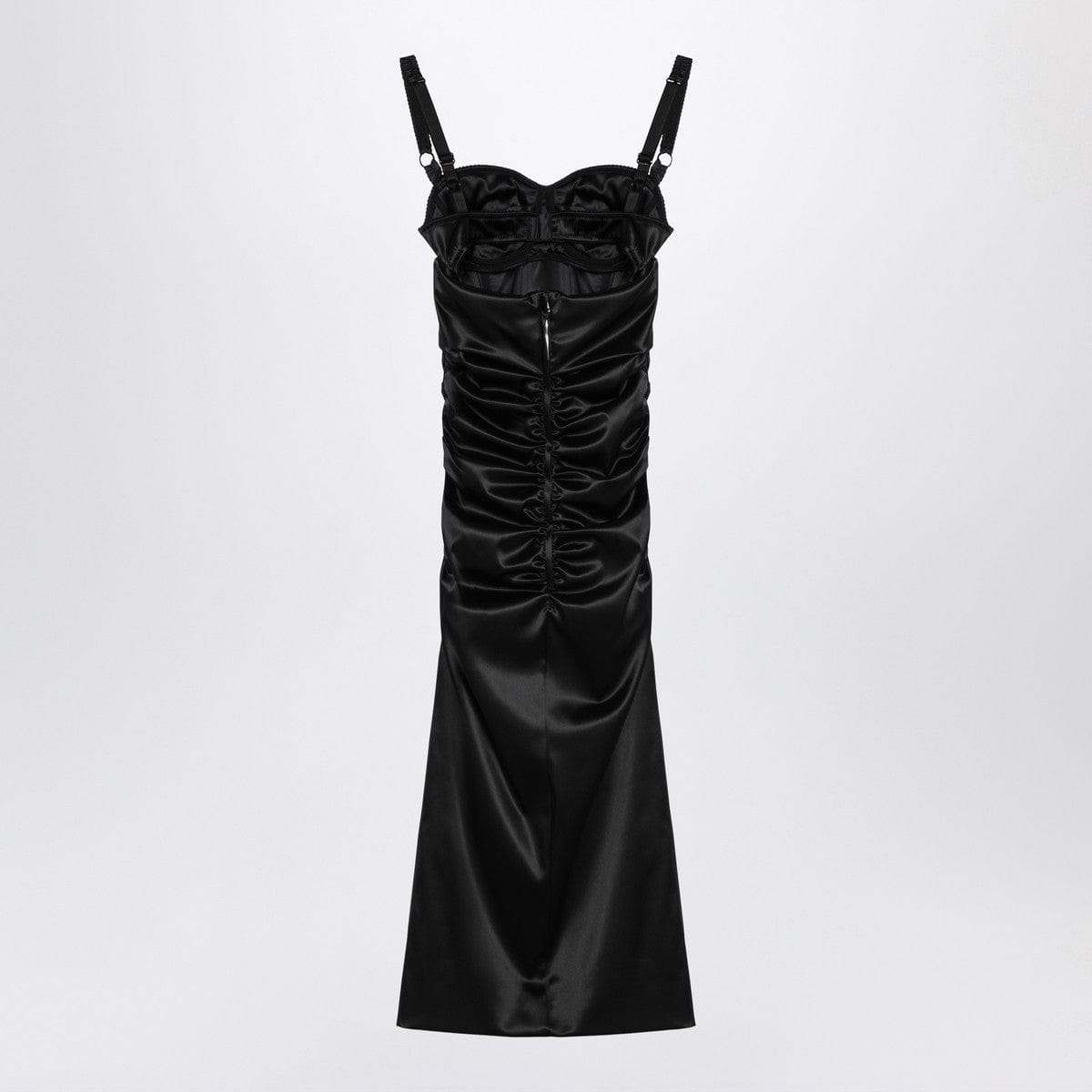 Draped longuette dress by Dolce & Gabbana in black stretch satin, featuring a bra detail, sweetheart neckline, lightly padded cups, adjustable elastic straps, and a back closure with zip and hook.