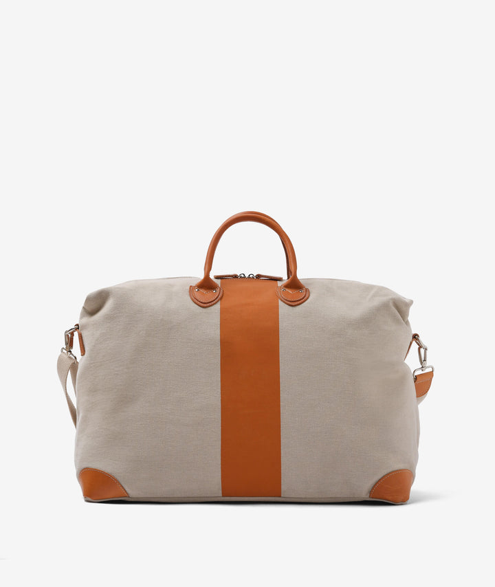 Crafted from durable sand-coloured fabric, it's embellished with an orange centre stripe that enhances its refined style. The handles, the reinforcements at the corners and the leather details give a touch of class and guarantee robustness over time. The duffel bag features an adjustable shoulder strap for convenient and versatile carrying, while the interior, lined in soft cotton, features a zip pocket for better organization of personal items.