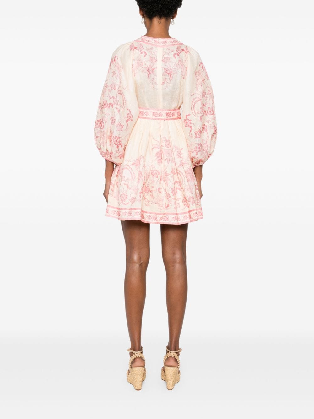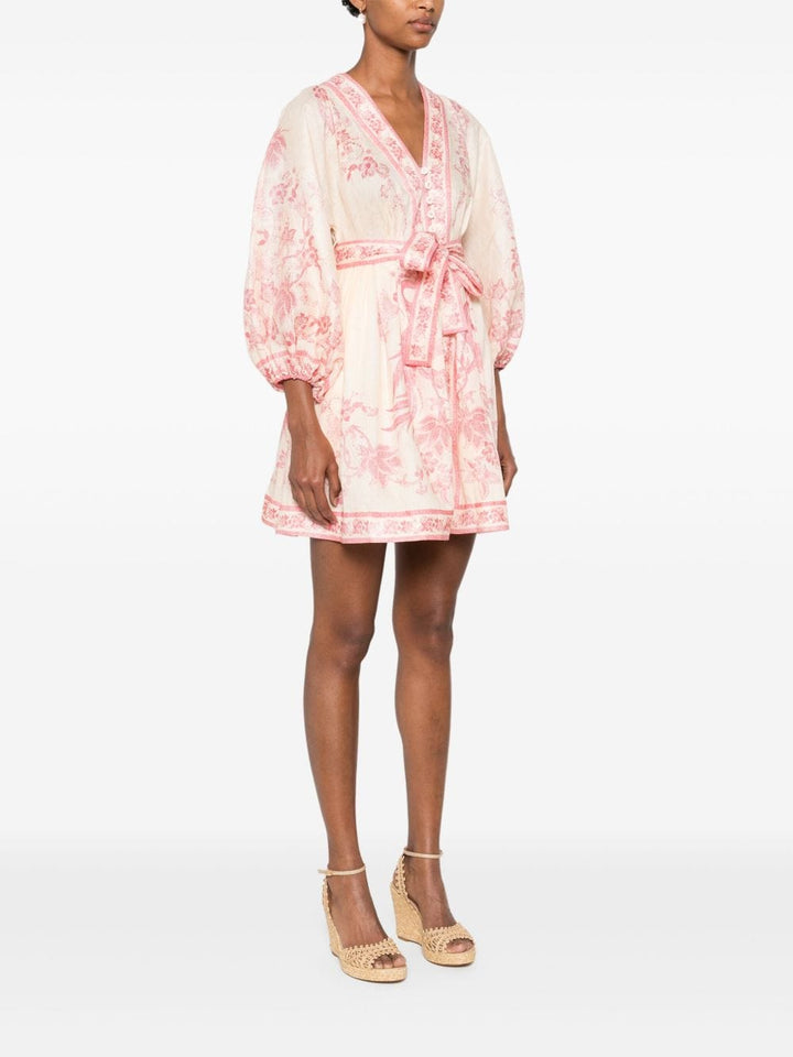 ecru front button fastening V-neck belted waist three-quarter length sleeves Lucky printed mini dress.