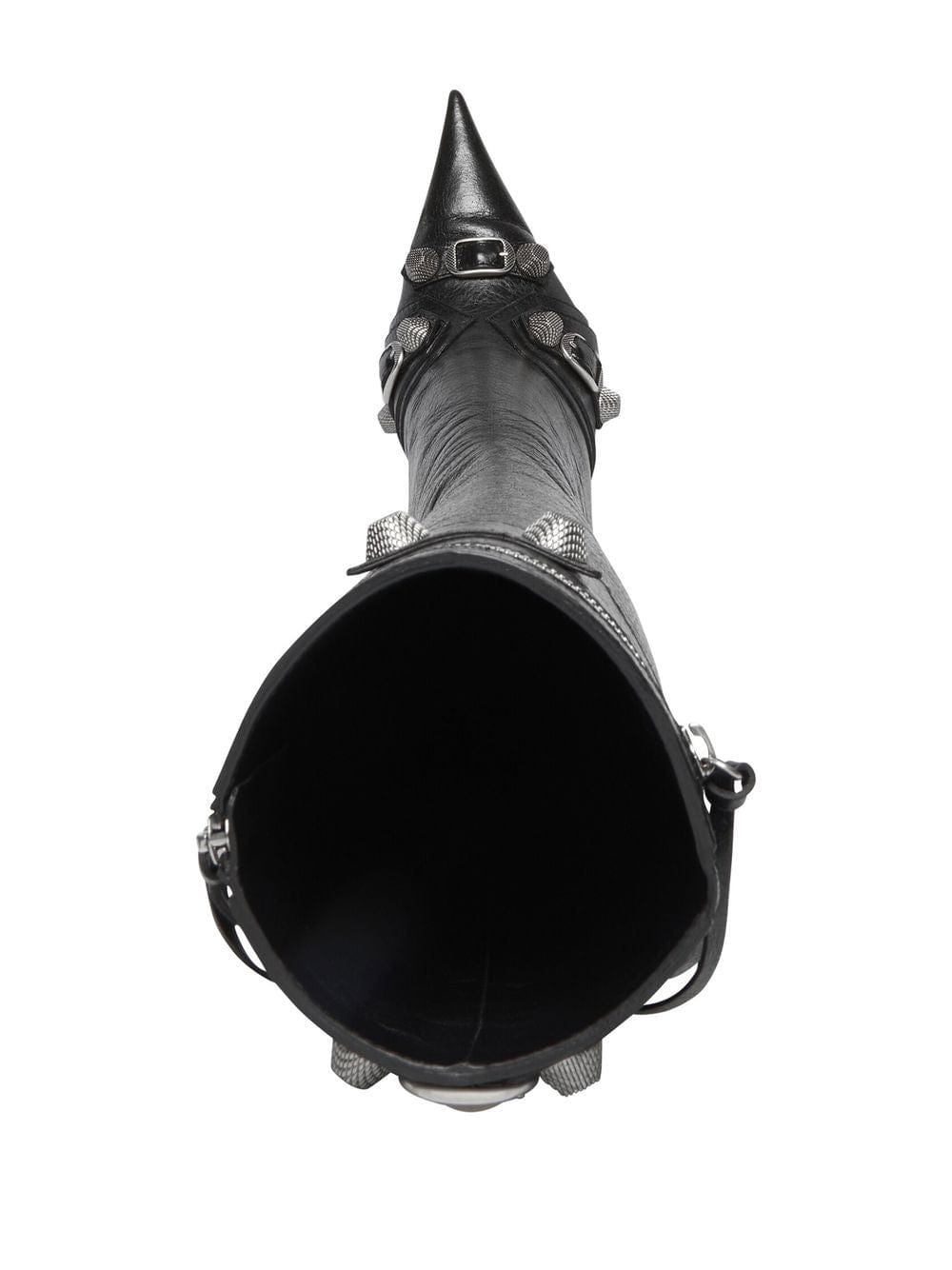 Cagole 90mm boots from BALENCIAGA featuring black, lambskin, pointed toe, high stiletto heel, palladium-tone hardware, stud embellishment, fringe detailing and side zip fastening. POSITIVELY CONSCIOUS: We've partnered with Good On You — an ethical agency that rates how sustainably brands perform across various people, planet and animal welfare criteria. This product comes from a Conscious brand that performs well in relation to their impact on the planet, for example ensures the use of materials that limit the amount of chemicals, water and wastewater involved in production processes.. Size and Fit - Heel 3,5 in / 9 cm