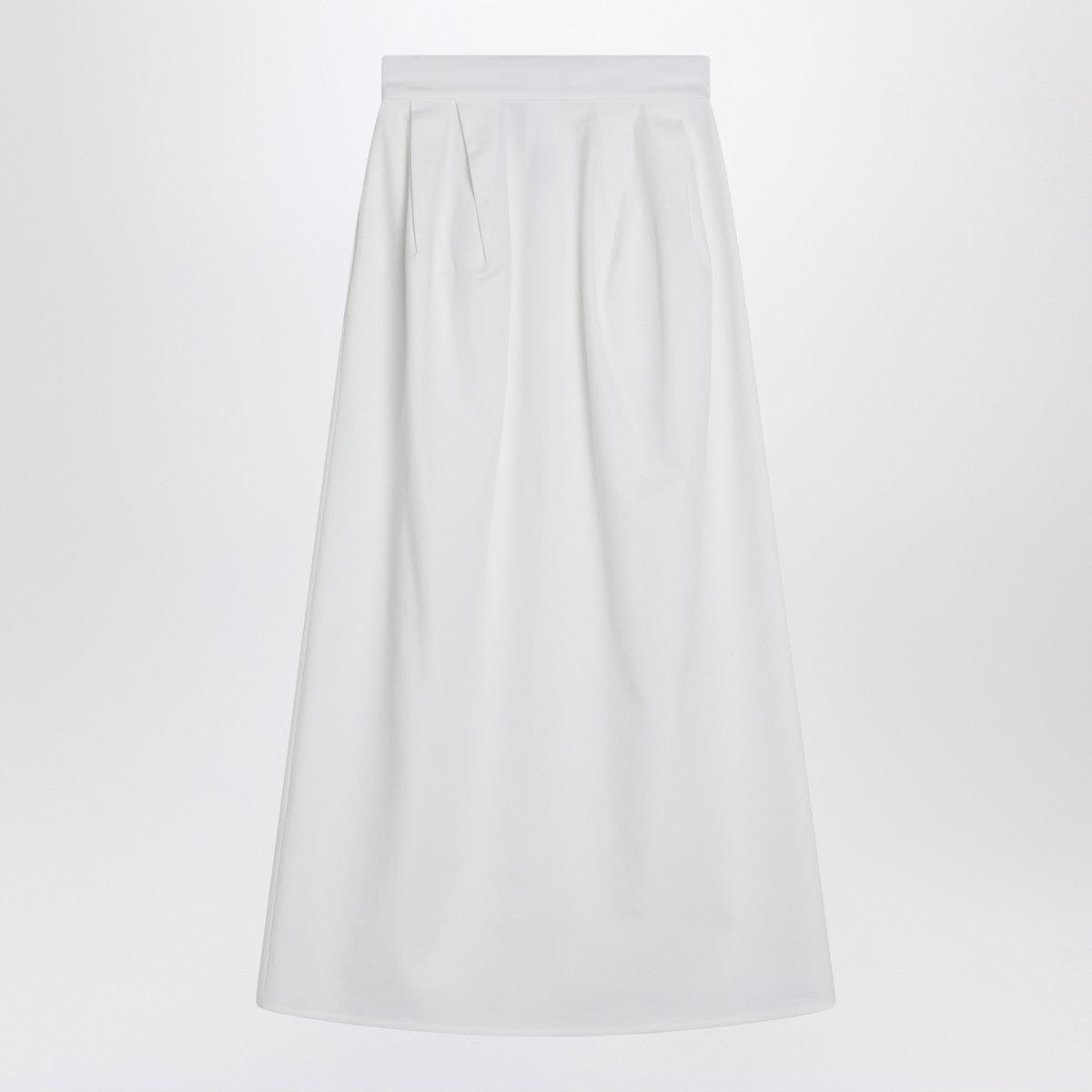 Long wide coat by Max Mara in white stretch cotton gabardine, characterized by a deep slit at the front, hidden button front closure, front pleats, and two side welt pockets.