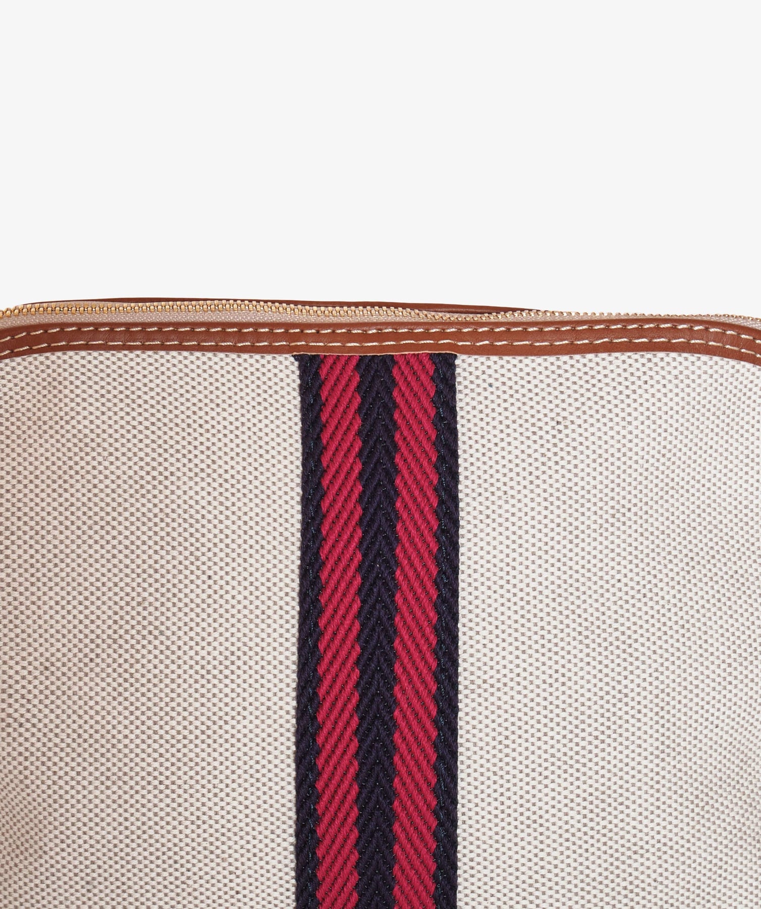 The Trousse Large Heritage in Natural Panamone reinterprets classic college aesthetics in a light, sophisticated summer version, combining a compact, luminous fabric with refined tan leather details for elegant structure.